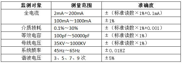 可對泄漏電流、介質(zhì)損耗、等值電容量、頻率、母線(xiàn)電壓及諧波分量等進(jìn)行監測;